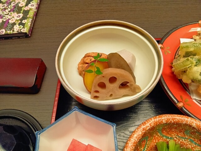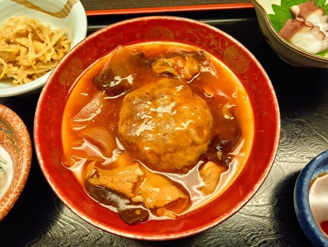 唐揚げ、肉豆腐、小鉢、白飯、漬物、