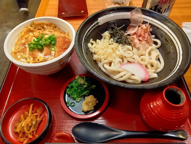 かつ丼とうどん、漬物のセット