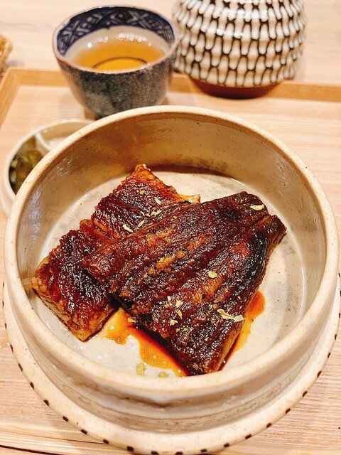 関東風に蒸して炭火でじっくり焼かれたうなぎはカリッと香ばしく身はふっくら脂が乗って、山葵と塩でいただくと絶品✨