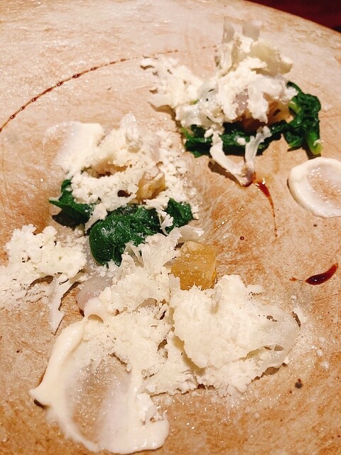 液体窒素で凍らせたカリフラワーのパウダーのシャーベットを仕上げに振りかけてくれるので、ひんやりとした新感覚の味わいを楽しめます。