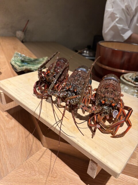 お鮨は活け伊勢海老を目の前で捌いてからの軽い炙りで甘さが引き出されていて、赤酢のシャリにマッチしてて、ほんとに美味しかったです。