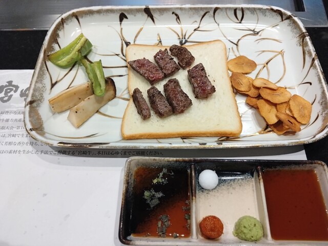 お肉はへるしーに脂身のない赤身。でも200g。かなりの量でした。赤身ですが柔らかく臭みもまったくありません。外国産とは違います。さすが日本一の宮崎牛。塩やワサビで牛肉本来の味を楽しめます。いろいろと味を変えられるので200gをペロッと食べきりました。