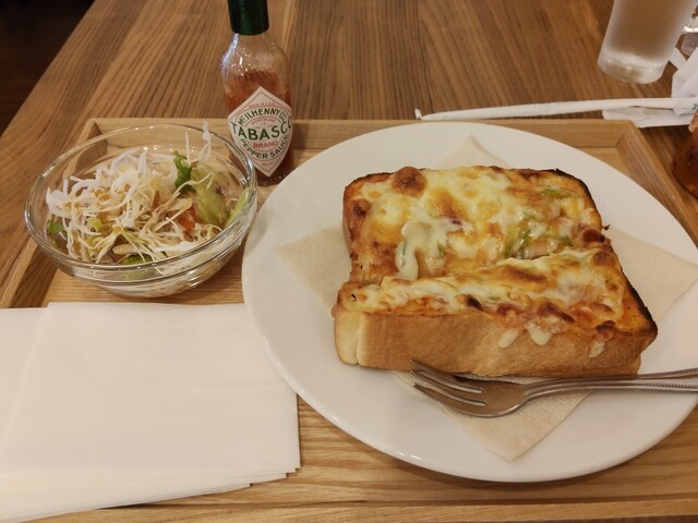 サクサクでふわふわなピザトーストは出来たて熱々ですごく美味しくて、珈琲の味はわからない人間ですがとても美味しくて、ミニサラダまでついて、このお値段。