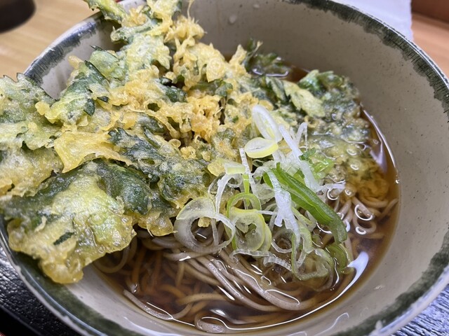 出先でもう一件と思い、さっと食べれる立喰を選択。地味な外見ではありますが、なんとビックリ!店内に入ると出汁や天ぷら、カレーの香りで食欲をそそります。春菊天そばを注文すると店員さんが慣れた手つきでおそばを用意。そこに春菊の天ぷらが乗せられ私の目の前にやってきました。その見目がとても美しい!パリッとした感触と中の春菊の緑とほろ苦さも最高です。つゆも旨くどんどん身体に染み込みます。駅から足を伸ばしても後悔させない、食いしん坊にとってはたまらない最高の間食!でした。