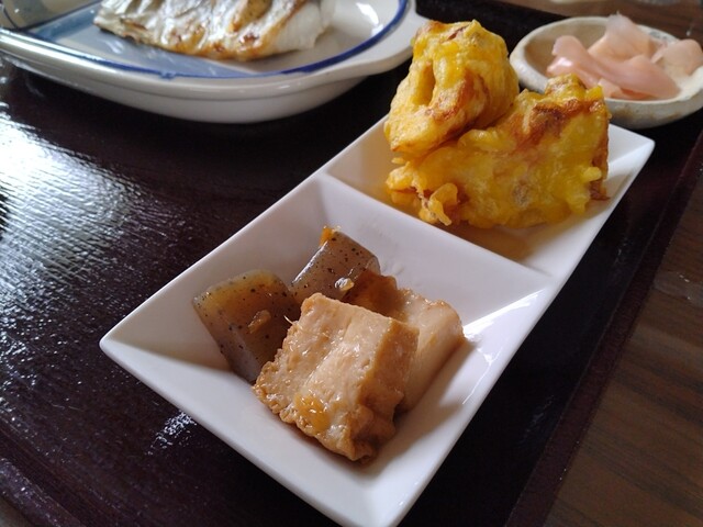 さばはまあまあの大きさで付け合わせには、煮物、ちくわの天ぷら、サラダと生姜だった。