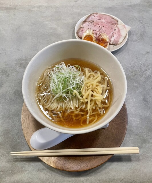 「きほん・醤油」(900円)を注文。うどんのような太麺、和出汁スープの組み合わせが美味しい一杯です。穂先メンマ、煮卵、厚切チャーシューどれも味わい深く、全体が上手くバランスとれてます。
