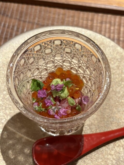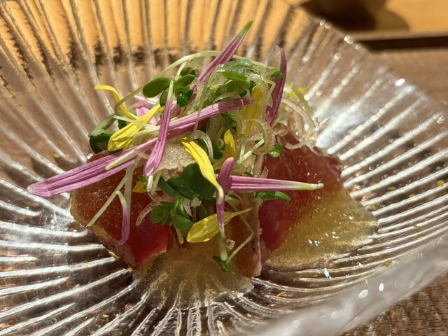 戻りがつおのカツオに神戸牛コンソメのジュレをかけたカルパッチョとたたきのハーフのような印象