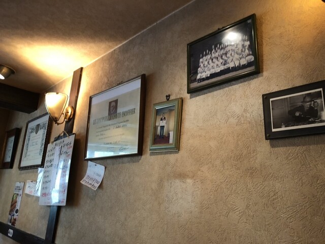 店内を見渡すとコック帽や古めかしいコックの集合写真、英語の賞状には、近代フレンチの巨匠オーギュスト.エスコフィエのネームが、料理に造詣が深い人ならピンとくるはずだ。