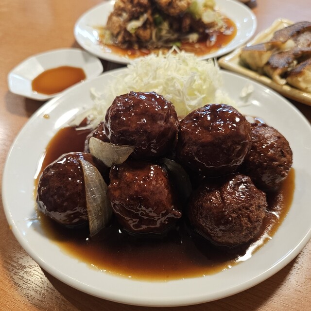 看板メニューの、肉団子は、一口でほろっと崩れるジューシーさで、直径5cmほどの大ぶりサイズで、外側はカリッと揚がり、中はふっくらジューシー。ひと口かじると肉の旨みがジュワ~ッと広がります。