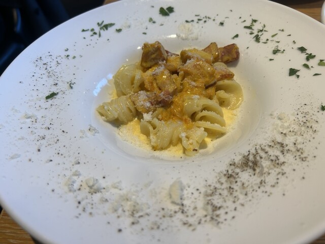 スパークリングワインで始まり、大きいボウルいっぱいのサラダ、選べるパスタがまた美味しい‼️今回はごぼうを使った塩味ラグーのリガトーニとベーコンとカボチャのクリームソースのフジッリにしました。ごぼうはソースに入っている茹で炒め?のものと、トッピングのスライスして揚げたものの食感の違いが素晴らしい‼️フジッリ、普通の店のフジッリとサイズが違って大きいです。両方ともとても気に入りました。いつも違うパスタで楽しみですが、今回のはまたあったら絶対食べたいです。