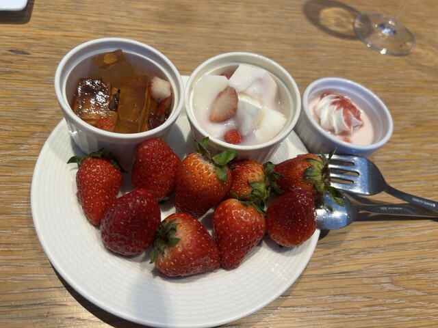 いちごのデザートはそれなり、わらび餅はわらび餅じゃなくてゼリーじゃないかと生苺目当てで行ってますが、今回はちょっとがっかり。物価高くなってるせいだと思いますけど。サラダバーとパスタが素晴らしいので、この値段でありがとうです♪
