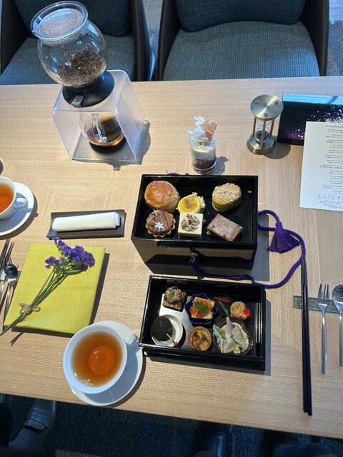 紅茶を淹れるポットも個性的で、モダンなホテルに合っています。伝統的な漆器とのコラボが面白いです。宿泊客だと少し安くなるのか、思ったより安かったです。