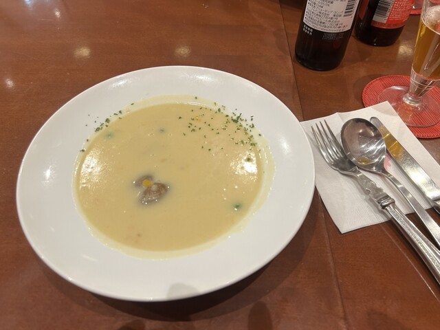 渋谷で食べるのは久しぶりですが2名で参戦。フィッシュ&チップスはレギュラー、エビもチップスつきを注文してからスープがあるのに気づいたので、貝のチャウダーを頼みました。貝はアサリ、野菜も入っていてクリーミーで美味しいです。具は貝、魚、エビ、野菜のどれかを選ぶのですが、王道貝で大正解。