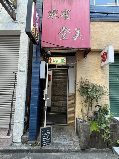 入口は「麻雀登美」の看板が目印で少しわかりにくいユニークな外観。