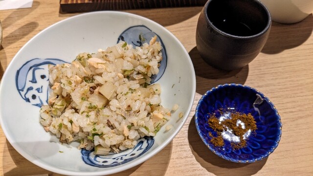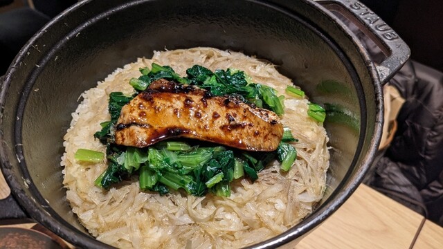 毎回楽しみな〆の炊き込みごはんは鰤が登場。前回は秋刀魚だったので季節を感じます。鴨鍋のお出汁が従来よりも甘さが控えめで好みの味つけに仕上がっていたので最後はお茶漬けでいただいた次第。