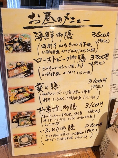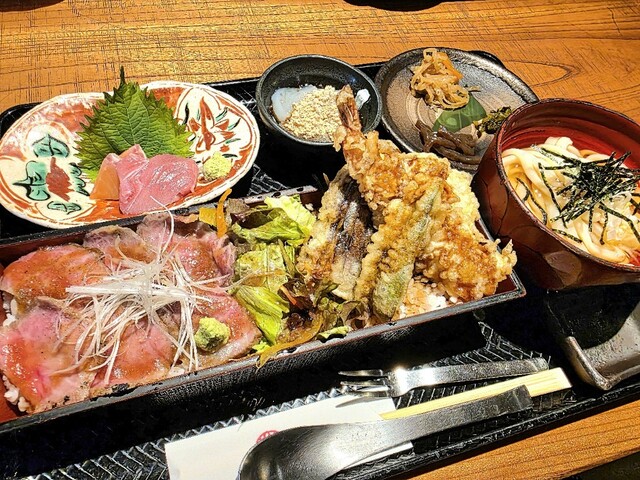最終的にローストビーフと天丼がハーフ&ハーフになっている葵の膳3,100円を注文。