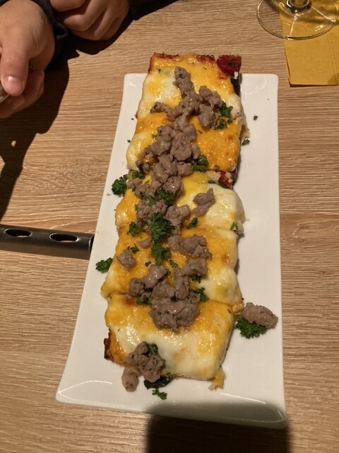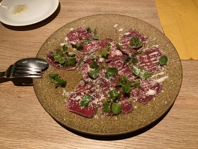 料理はピザ、カルパッチョ、鹿肉、オムレツ、ガーリックトーストなど、たくさん注文