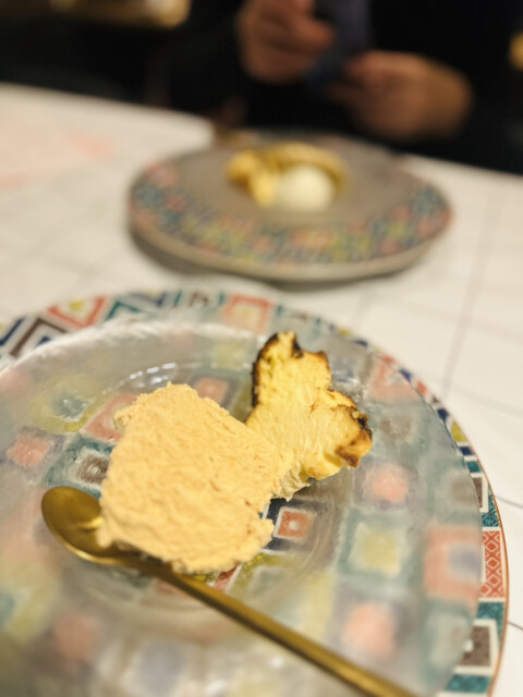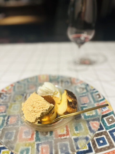 ドルチェはヨーグルトのソルベ、バスク風チーズケーキ、キャラメルのパルフェ。