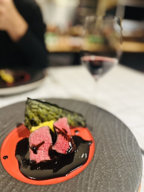 メインにはしっかりとした赤ワインが合わせられ、脂の旨みをスッと流してくれます。