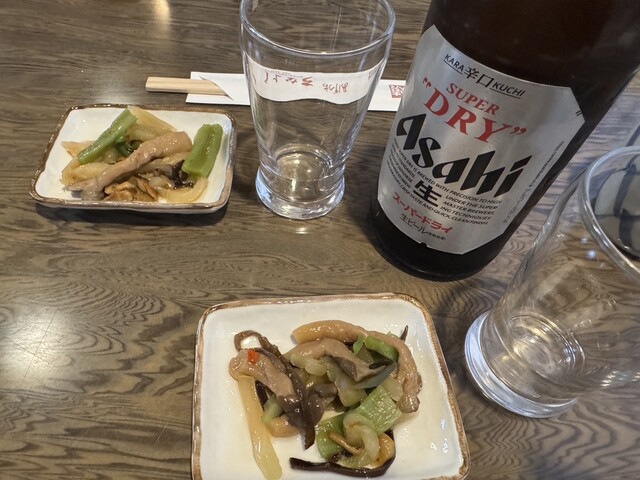 すぐにビールとアテが提供。漬物とお浸しのミックスみたいなあまり食べたことないタイプ。店内は座敷に3卓、椅子席が4卓。
