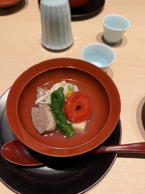 一品ずつ提供時に店員さんから説明があります。氷頭は自らは選ばなそうだし、とても良い経験でした。最初の蟹身と蟹味噌の和え物でもう期待を超えて来てくれます。合鴨は適度な歯応えで旨みが感じられます。八寸は飯蛸煮付けが大きいのにとても柔らかく2つあって嬉しかったです。鮟肝で日本酒が進みました。蟹刺しはお醤油皿に驚き。提供された蟹が半透明で繊維が見えます。酢橘を絞るとギュッと縮まり新鮮さを再確認しました。蟹の甘みをダイレクトに感じられました。蟹しゃぶしゃぶはレアとミディアムがあり、どちらも美味しいのですが、ミディアムが好みでした。メニューの順と違い、先に伊勢海老半身焼きの提供。半身ですこんなに大きいのか、と思うほど肉厚でした。海老味噌もとても美味しい。蟹焼きはジューシーで初めて体験した美味しさ。蟹味噌コロッケは赤ワインに非常に合いました。蟹蒸しと釜炊御飯の時はかなりお腹いっぱいになっているのですが、ご飯が美味しい。しかも蟹蒸しと一緒に食べられて幸せです。最後に一口サイズの甘味とお茶を頂きごちそうさまです。食べきれなかった蟹蒸しと釜炊御飯はお土産にしてもらいました。