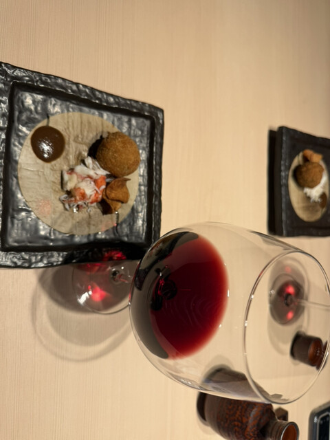 4人がゆったり座れるであろう個室に2人なのでとても贅沢な空間です。今回初めてペアリングにしてみたのですが、お料理を堪能しつつ、お料理に合ったテイストのものをチョイスされているので非常に便利、と知りました。
