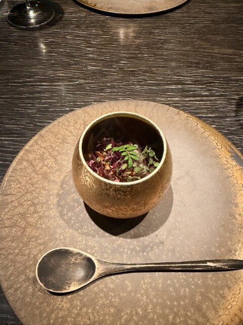 水葉樹(Water / Leaf / Tree): 最初の一口から、透明感のある出汁のような“水”の余韻がふわり。葉と木のイメージが料理に静かに宿っていて、まるで森の中で食事をしているよう。