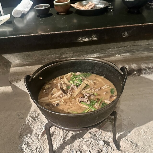 ジビエ、お肉もお鍋もとっても美味しく頂きました。お肉はお塩で、お鍋は味噌ベースのお味です。狩熊鍋は野菜がたくさん入っててとてもヘルシーなお鍋です。