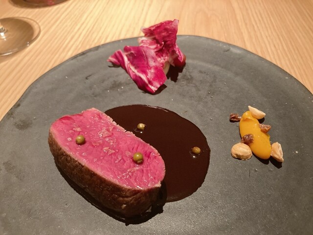 お肉は赤身だけの部分と、脂身が付いた部分とで2切れ盛られていて、柔らかく、稲藁の香りをまとっていて、火入れが完璧な具合です。赤ワインのソースに胡椒の実が入っていて、これがまた芳しく、よりいっそう美味しいです。ピスタチオの香ばしさと油脂感もとても合う。