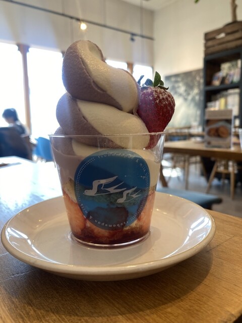 お昼過ぎころに行きましたが店内は半分ほど席が埋まっていました。ソフトクリームを食べたくて行ったら期間限定?のいちごのショートケーキとソフトクリームが一緒になったものがメニューにあり注文。甘くてとっても...