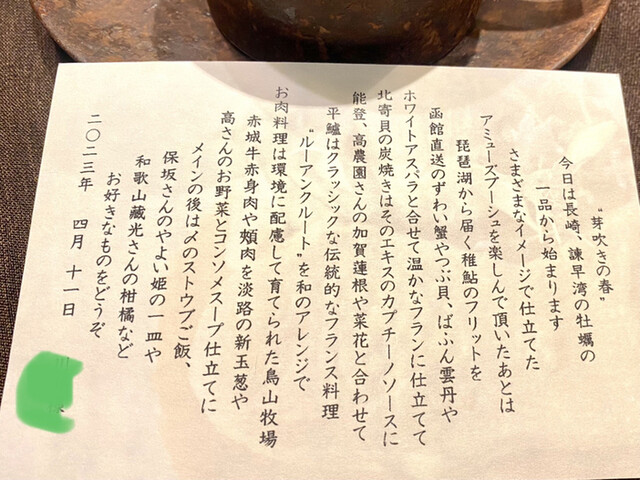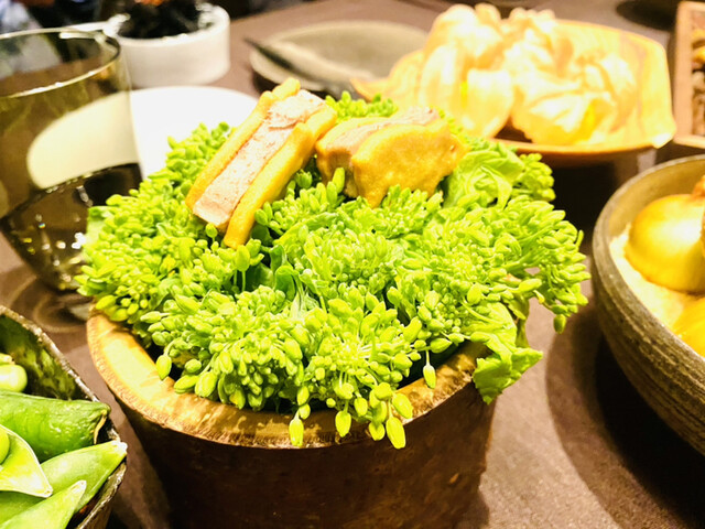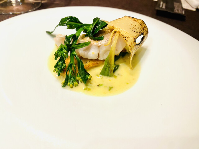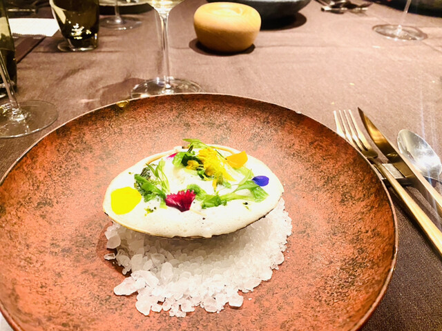 ・稚鮎のフリットをずわい蟹、つぶ貝、ばふん雲丹、ホワイトアスパラガスとあわせて温かいフランに仕立て加賀蓮根や菜の花とともに