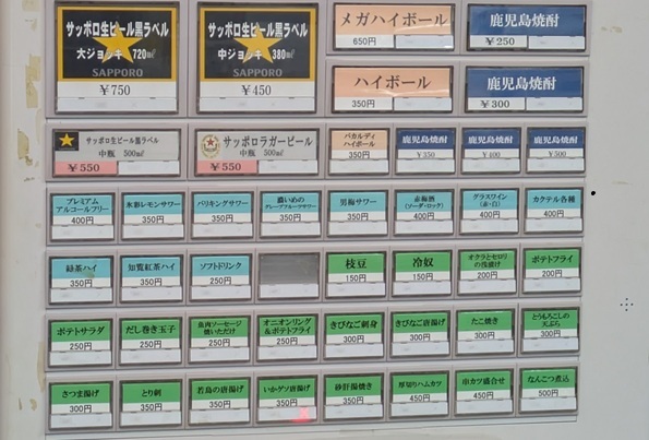 もう2回目だから、システムは分かってる。まず自販機でチケットを買う。アテ用に【さつま揚げ】300円。こっちのさつま揚げ、美味すぎるんよ。前回衝撃受けたもん。で、飲みは【鹿児島焼酎】。鹿児島焼酎といっても、値段はいろいろ。今回は時間も少ないから、一番安い250円。