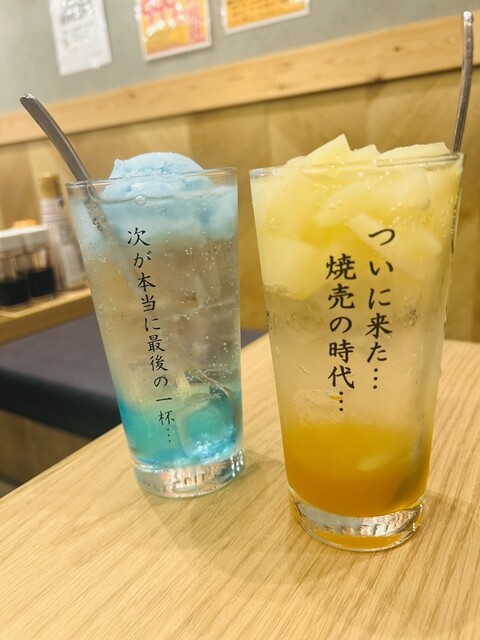 「ついに来た…焼売の時代…」「次が本当に最後の一杯…」といった文字入りグラスが可愛くて、思わず写真を撮りたくなるビジュアル。