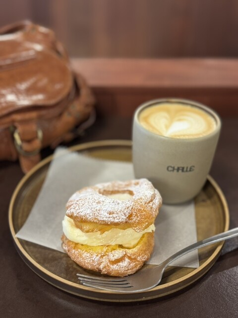 たっぷりクリームの入ったドーナツと、カフェラテを☕️