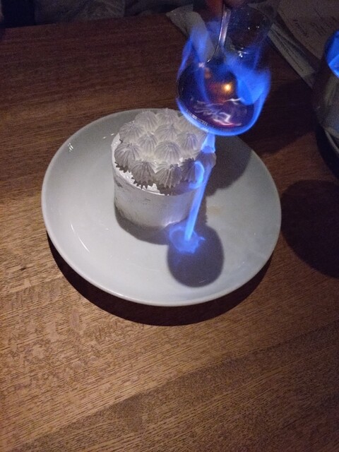 誕生日会 青く燃えるケーキベイクドアラスカ スパーリングワインで乾杯 DJさんサプライズの誕生日コールありがとう!流石Legato(=^・^=)〜