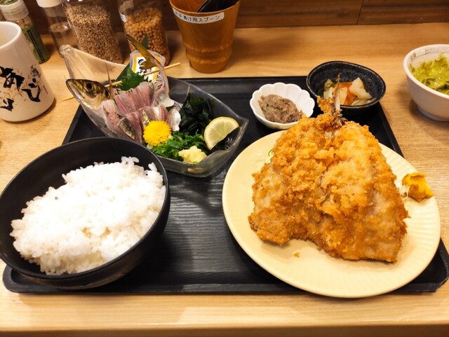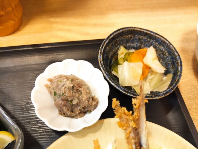 鯵フライ、刺身、なめろうは食べたいと思い、緑のタルタルどうしようかと考えたが、一度は試そうと思い満喫定食を注文。