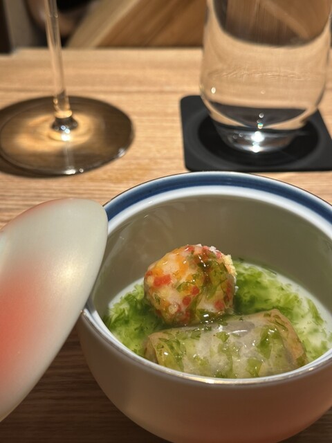 二日間寝かしたスープらしくトリュフオイルが入っておりワイングラスで飲むことによってより一層トリュフのいい香りが