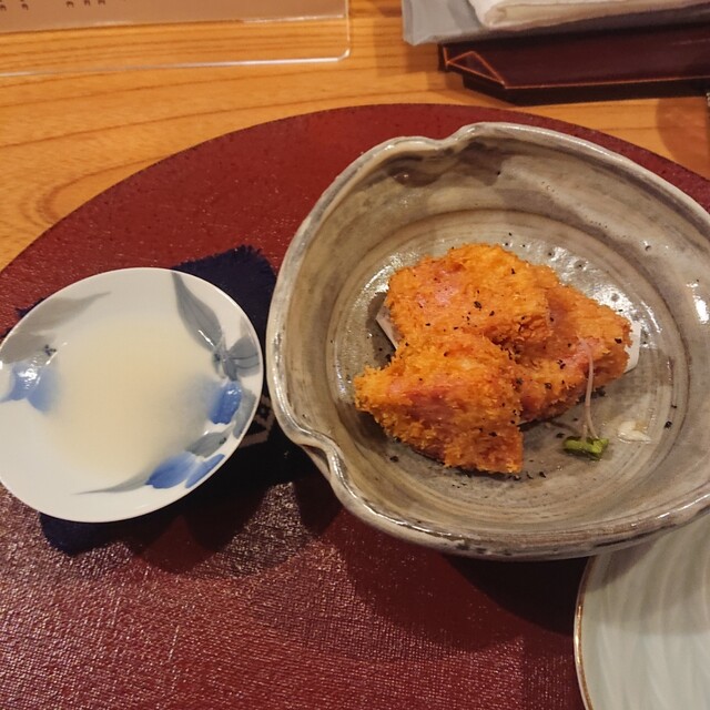 五品目が昆布を豚肉で巻いた料理、これにはぶた燗が合いますよとのことで、滋賀向井酒造のラベルがまさしく豚のお酒を燗して頂いた。昆布を豚で巻くというユニークな料理も旨かったが、らっきょで作ったタルタル風の付け合わせが酒のあてにちょうど良かった。