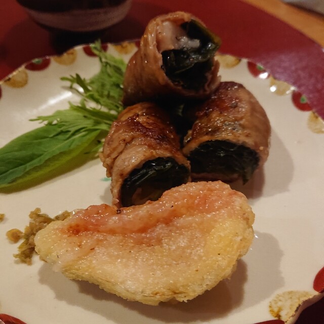 〇 牛肉と梨の春巻き(木の芽味噌掛け)