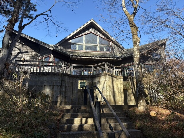 階段を上がって行くと別荘のような山小屋のような雰囲気の建物です。