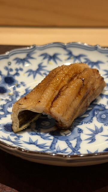 ・煮穴子(ここのお店の醤油は甘さ控えめ。なので煮切り醤油も甘さ控えめなのだが、それがまた良いっ!キリっとした中にほのかな甘みと穴子の味と香りが合わさりとても良い。)