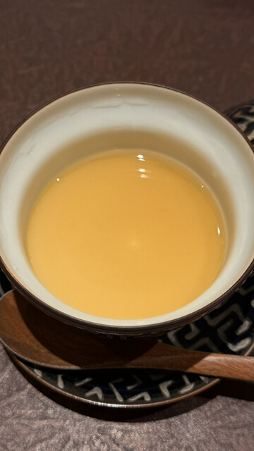 ・デザート(ピスタチオのパンナコッタとほうじ茶。甘〜いパンナコッタは卵の甘さとはまた別方向。ほうじ茶でほっこり。最高の〆)