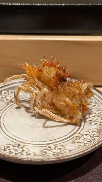 ・渡り蟹と松茸の春巻き(カラスミがかかっている。もちろんそのまま食べても美味い。春巻きの具で季節を感じる)