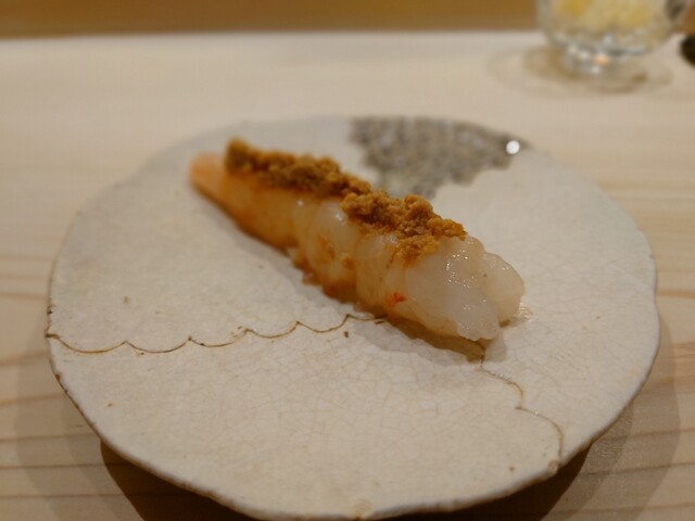 牡丹海老 ワタやすり潰した海老の殻?が混ぜてある味噌が絶品。一口大にカットされている