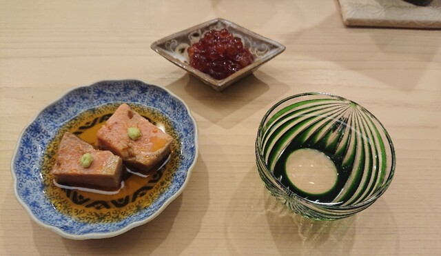 コース構成は前半は摘みが八品ほど出た後にお腹の状態を聞かれて摘みのリクエストタイム、握りの後半はラスト前の穴子、玉子焼きの前に握りのリクエストタイムがあり、余力を残しつつ味わいたいものを注文していきます。