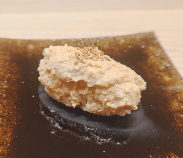 大とろ前の青森の紫雲丹の口内で拡がる海の幸のエキスが素晴らしい体験。大とろの前に持ってくるのが◎
