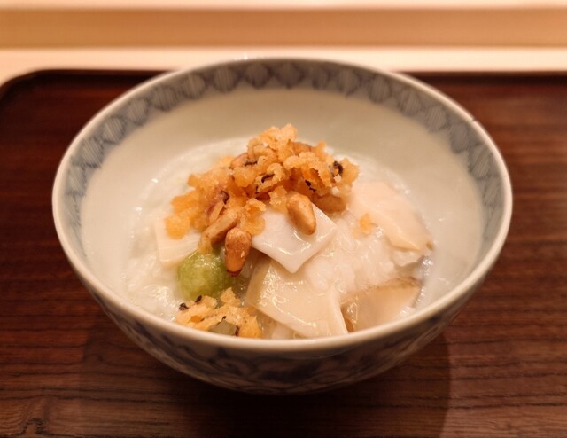 鱧と鮑のお粥(鮑の肝/シークワサー/松の実/銀杏)