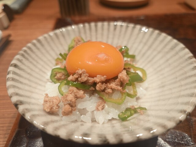 よもや焼き鳥店で味わえるとは思わない挽きぐるみの平打ちの蕎麦で清涼感を得てご飯物へ。蕎麦も水木氏にて打たれているのか風味と平打ちの柔らかなこしを楽しめる仕上がり。