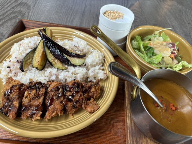 一番有名なカツカレーを食べたかったけど、思ったよりボリューミーに見えたので半分は茄子があるものをセレクト。