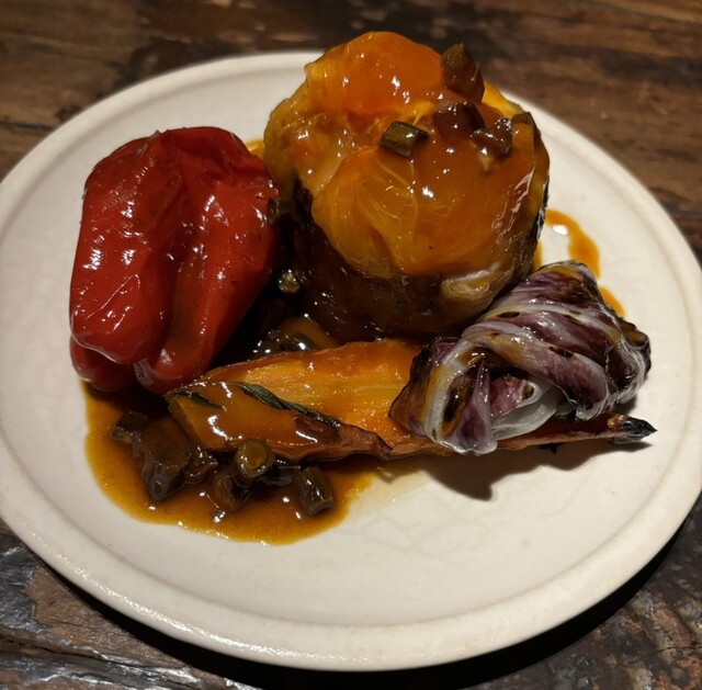 カボチャ、ナス、サツマイモと魚介のスープ